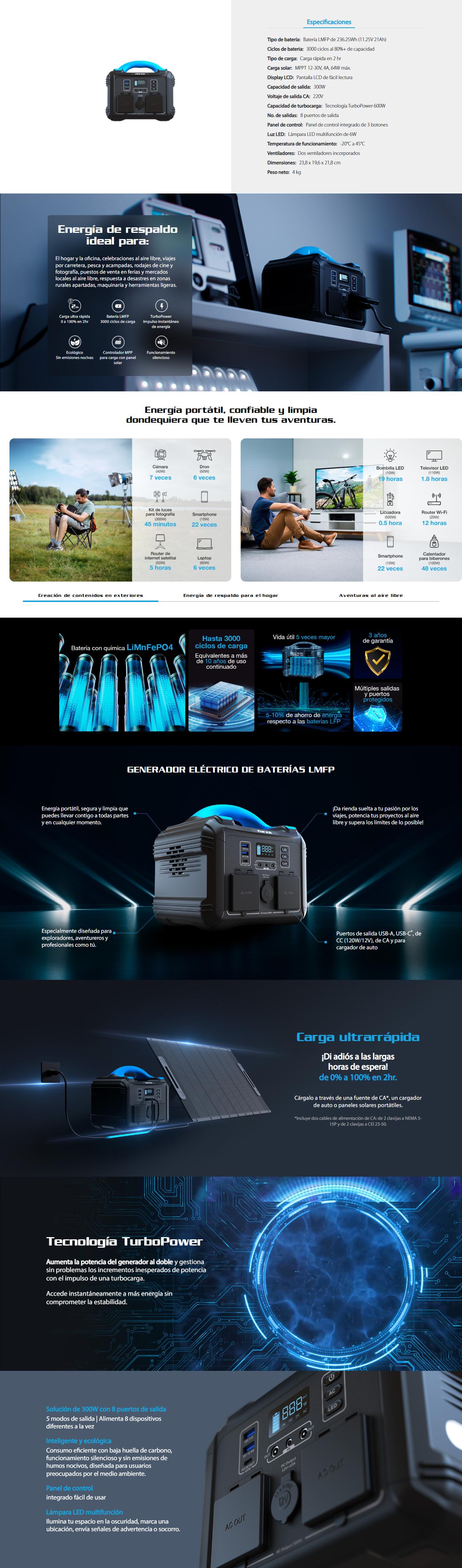 | Potencia de salida AC | 300W continuos, 600W pico |