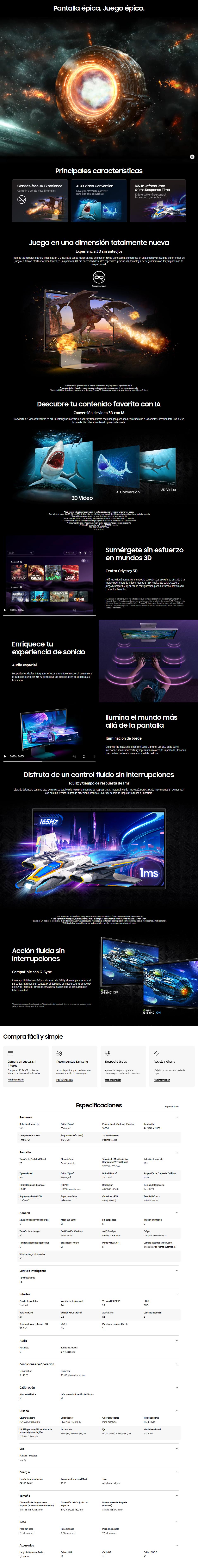 El **Samsung Odyssey 3D G90XF** (modelo LS27FG900X) es un monitor gaming premium de 27″ con resolución 4K UHD, panel IPS de alta velocidad (165 Hz / 1 ms GTG), que introduce lo último en inmersión visual: tecnología 3D sin necesidad de gafas. Gracias a un sistema de seguimiento ocular y lentes lenticulares, ofrece una experiencia tridimensional realista. Además, incorpora IA para convertir vídeos 2D en 3D.