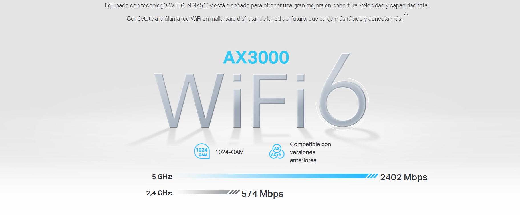 - AX3000 Wi-Fi 6 de doble banda Velocidad: 2402 Mbps (5 GHz) + 574 Mbps (2,4 GHz).†