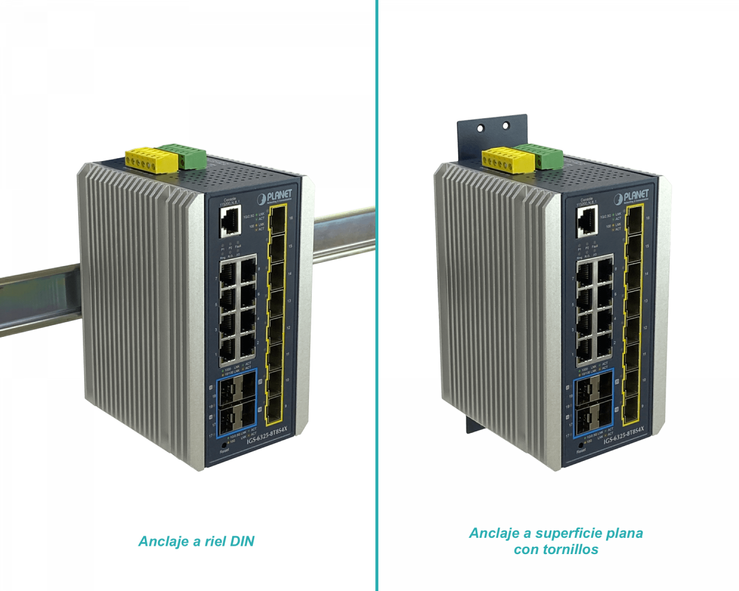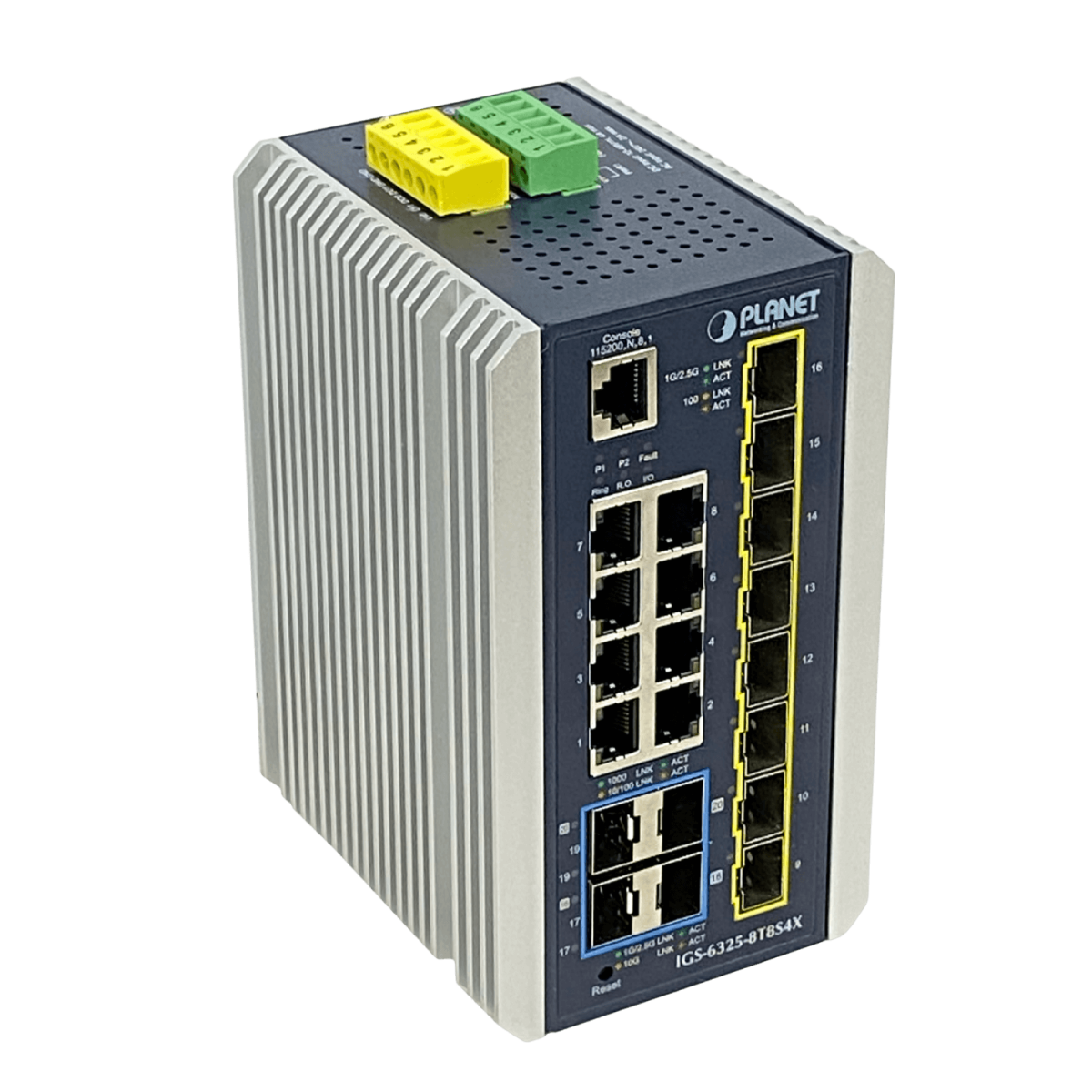 La serie de conmutadores administrados industriales de capa 3 PLANET IGS-6325 no PoE incluye 8 puertos de cobre 10/100/1000BASE-T, 8 puertos de fibra SFP 100/1000/2500BASE-X adicionales, 4 puertos SFP+ 10GBASE-SR/LR y enrutamiento IP de capa 3 en una carcasa de metal resistente IP30 para un funcionamiento estable en entornos industriales exigentes.
